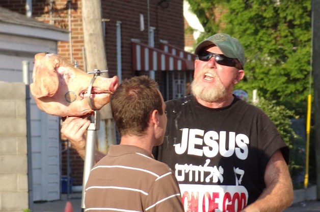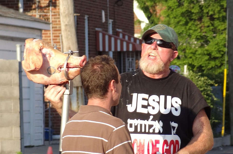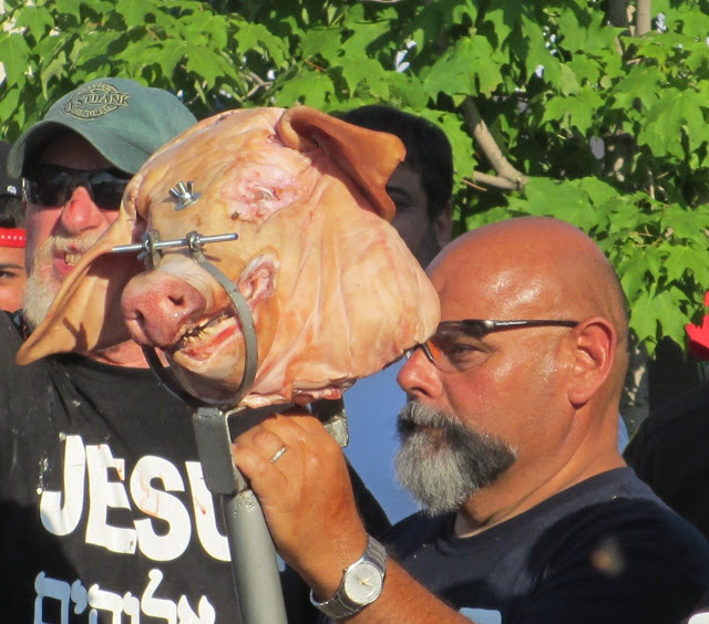 Before going into Dearborn there was much preaching in Los Angeles as I preached at about 5 events in seven days prior to leaving for my out of town preaching. The Lord allowed me to preach at two hockey championship games, an event at the Los Angeles convention center, a Van Halen concert and the sodomite parade in West Hollywood. All with different banners and a tailored messaged for each venue. Living in any big city one does not need to fly to events as you can be the sidewalk event on any given day. We arrived in Bowing Green Ohio on Thursday and this was our travel day as street preachers from West Virginia, South Carolina, New Mexico and California yoked together with a couple local men to preach the largest Arab Fest in our beloved nation. Many Christians have preached and talked against the god of Islam from the pulpit or via computer but rarely will they confront them with the same massage to their face……..except us.A law firm had sent a letter to the city and the Sheriff’s Department (as they were to police the event) that we were coming to town and we were covered by free speech laws weeks before we arrived but they never responded. We also had a good Detroit lawyer in his office every hour we were on the streets of Dearborn, if needed and with the many prayers from you, we walked into the Dearborn Arab fest with banners raised. Oh, and did I forget to add, with a pig head on a pole?