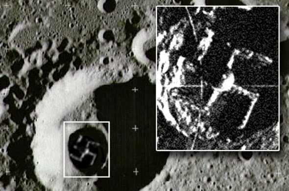 The Nazi’s formed their own splinter group during the early 20th century and made an alliance with the Dracos in the 1930’s. They got UFO tech from them, and there was aGerman Rosewell with greys inside. Also had telepathic contact [RE: The Black Sun and the Luminous Lodge The Vril Society, the Luminous Lodge and the Realization of the Great Work] which lead to a meeting in 1936 in the Himalayas. The Nazi’s wanted to have their own independent space civilization without the Dracos, and got as much tech as possible from them. They went to Antarctica, and found massive domes for living structures from an ancient civilization, and set up bases there [RE: Are there really Pyramids in Antarctica?]. They also went to the moon, and found ruins of an ancient civilization of beings 70 feet tall. With massive rooms, but no tech because it was plundered long ago. The Nazi’s set up a base on the moon, in the shape of a swastika.
