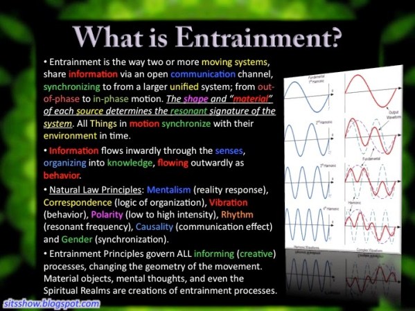 This Week – Entrainment, Communication, Information and Evolution – we discuss entrainment, the universal process of evolution, communication and information sharing. Information literally in-forms us, changing our identity and resulting behavior. All Creation uses the mechanisms described within entrainment, which is a synthesis of all 7 principles of Natural Law: Mentalism, Correspondence, Vibration, Polarity, Rhythm, Causality and Gender. The interconnectedness of all life works through and with the entrainment process. With these concepts in mind, we will be able to analyze the inner workings of the mind body spirit activities of personality attainment; evolution.