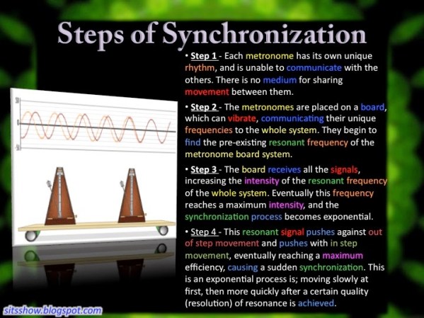 In preparation for this show, please watch this short video of metronomes synchronizing: