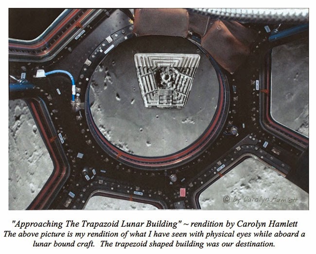 The [below] picture is my creation from my memory. I put the picture together to illustrate what I have seen with physical eyes while aboard a lunar bound craft with other humans. The trapezoid shaped building was our destination. My first thought when I saw this structure was of its unique and significant shape, that of a de-capped pyramid and how much in architecture it reminded me of the Pentagon as seen in aerial photographs. Therefore, I chose a portion of an aerial photograph of the Pentagon to best illustrate the architecture of the actual building I saw on the moon. The rendition I have created is very much like the view I had as the craft I was in was making its approach. However, the actual building on the lunar surface does not have an inner court yard.