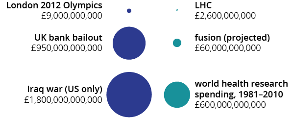 Of course, it’s not quite as simple as that: if a huge international collaboration clubbed together and wrote fusion researchers a cheque for £60 billion, we couldn’t have fusion next week; it would take time to build the labs, train new scientists to work in them and do the experiments to find out what works. But there’s a pretty compelling case that more investment would bring the results in faster. Plus, that means we don’t even need to pay that £50 each in one hit: we get a few years to scrape it together. (For more on making sense of the cost of large research projects, see the Big science page.)