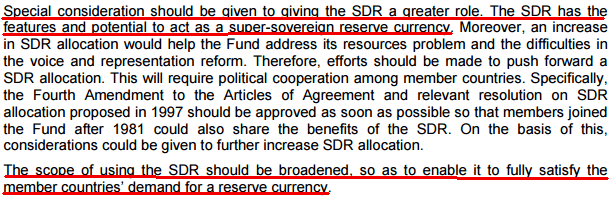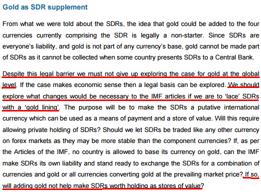 Allowing the IMF to issue more SDRs than they have gold hearkens back to the era of bank-issued Gold Certificates and their eventual monetary debasement; not a new scheme by any means. Nor are “residual” gold claims, which were commonplace during the Bretton Woods era. The last statement, “not include any right to sell SDR for gold,” would effectively ensure that gold could never be redeemed by “citizens” from banks, assuring gold coinage would never actually circulate.