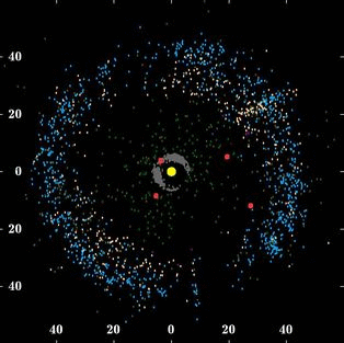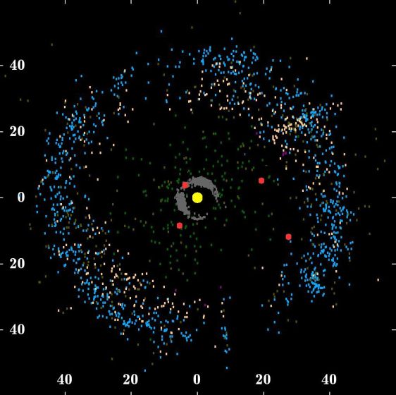 The Kuiper belt is situated mainly in the ecliptic plane just outside Neptune’s orbit. You can see a picture of officially discovered Kuiper belt objects, seen from above. The yellow dot represents the Sun, four red dots gaseous planets of our Solar System and the white and blue dots represent officially known Kuiper belt objects: