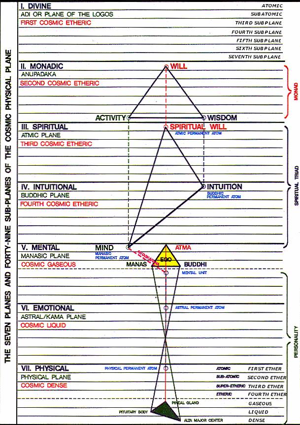 In this graphic, you see 7 major planes, each divided into 7 sub-planes. The physical world is only the 3 sub-planes at the very bottom of the graphic : ‘dense, liquid and gaseous’. The dotted line above gaseous is the plasma plane. The 4 sub-planes above plasma are the Etheric plane. The 7 sub-planes above Etheric are the Astral plane.