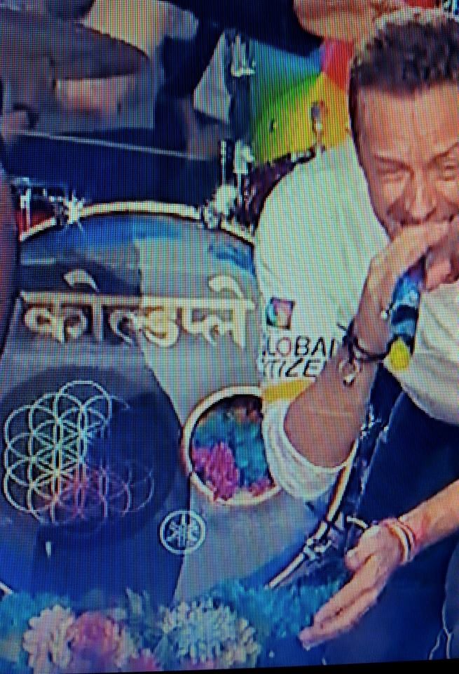 Update – A reader was kind enough to send me a screenshot of the Cold Play performance, showing the flower of life symbol on the kick drum. There is also what looks like a form of asian writing above the flower symbol. If anyone can translate that writing please let me know. Image appears after the embedded video below.