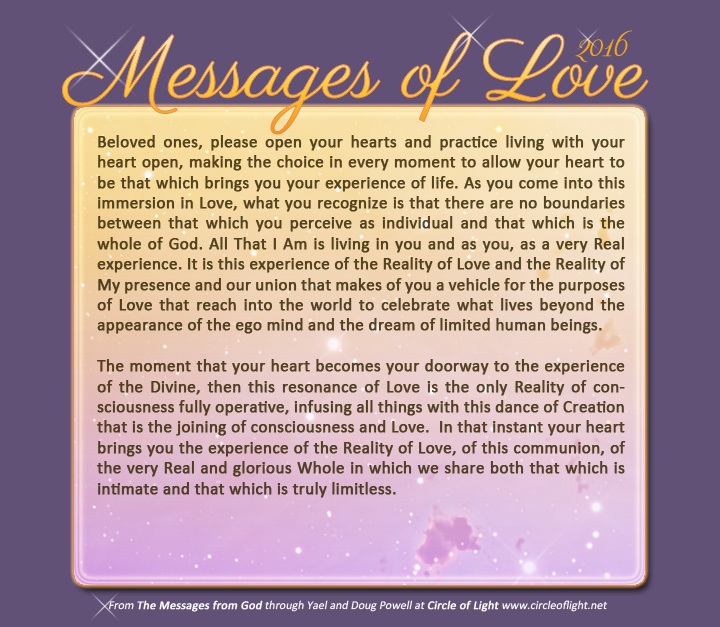 Beloved ones, please open your hearts and practice living with your heart open, making the choice in every moment to allow your heart to be that which brings you your experience of life. As you come into this immersion in Love, what you recognize is that there are no boundaries between that which you perceive as individual and that which is the whole of God. All That I Am is living in you and as you, as a very Real experience. It is this experience of the Reality of Love and the Reality of My presence and our union that makes of you a vehicle for the purposes of Love that reach into the world to celebrate what lives beyond the appearance of the ego mind and the dream of limited human beings.