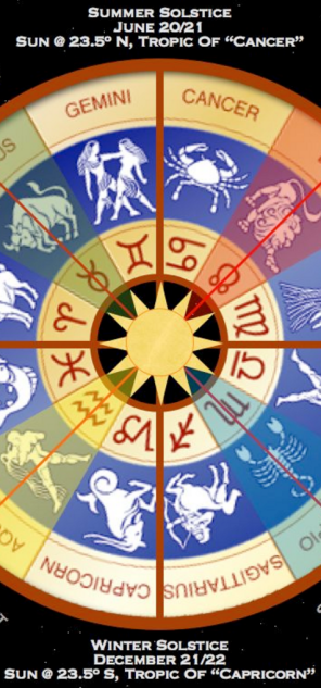 On a standard globe used in geography, one can find the lines marked the Tropic of Cancer and the Tropic of Capricorn. These represent the maximum southern and northern points of the Sun as it moves in the sky throughout the year. When the Sun reaches the angle of 23.5ºN with respect to the equator, the Summer Solstice begins, entering the sign of Cancer. When the sun reaches the angle of 23.5ºS with respect to the equator, the Winter Solstice begins, entering the house of Capricorn.