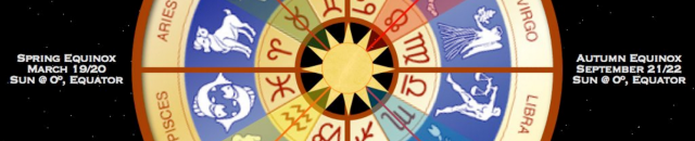 The term Equinox literally means equal night. The angle that the Sun has with respect to the Earth’s equator during the equinoxes is zero degrees; these two points on the Zodiac are on either side of a horizontal line. These are the two times of the year when day and night are equal, falling on the seasonal transitions of Spring and Fall.