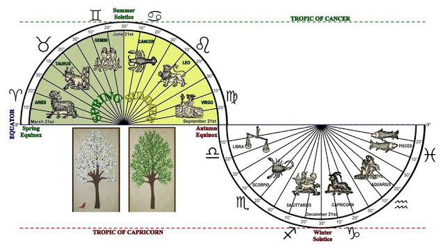 The year can be further broken down into the Season of Life, marked by the Sun’s emergence from the Southern hemisphere on the Spring Equinox, and the Season of Death, marked by the Suns recession into the Southern hemisphere on the Fall Equinox. Within these two seasons, the archetypal story of the Zodiac is told as an allegorical tale of the symbolic creatures associated with each of the 12 signs. The progression of the Zodiac is a symbol representing the evolution of consciousness, for an individual and the planet at large.