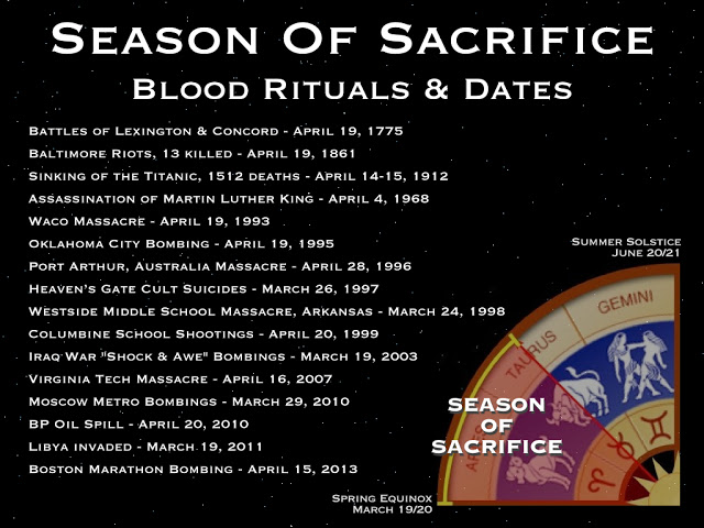 The Season of Sacrifice is a 40-day period between March 19th and May 1st. Its name was coined by the Dark Occultists of this world, otherwise known as the Cabal, Illuminati or NWO, who believe that the Earth must be bathed in the blood of innocents to ensure a fruitful harvest and to invoke an archetype of the destructive forces of the universe.