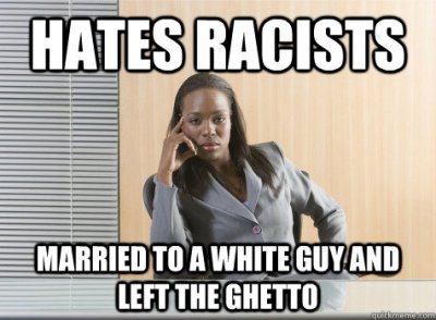 | Image Source. Here is an example of token gesture social justice. Here, the implication is that because she “left the ghetto” to “marry a white guy” she is now a racist. But the inference is itself racist because the meta-message is that those who intermarry betray their race, which is an unfounded premise, a prejudicial belief that spreads more racism. |