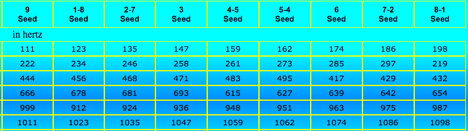 You will notice that the doubling pattern (vertical column) is used in the same way as I wrote regarding the patterns of the Sri Yantra (The Jericho Moment… http://gwhardin2.herokuapp.com/articles). But in this case there is a division of the doubling within each seed: (A) 1 … 2 … 4, and (B) 8 … 7… 5 (4 x2=8 … 8×2=16=1+6=7 … 7×2=14=1+4=5). So in the angelic Tonal Gateways, all the tones begin with these lower numbers (1, 2, 4). The reason for the division of the “doublings” is that the angels are connecting Heaven with Earth, with 1, 2, and 4 being the earthly tones. On the other side of the gateway, the angels sing the tones (what we call the “angelic choir”) that begin with 8, 7, and 5 as the energy bridge is connected between our worlds (6, 9 and 3 come from the Heart of Source, with the tones beginning with 3 also on the angelic side of the gateway). Both humans and angels must be present at the same time for this to work. It is a beautiful experience.