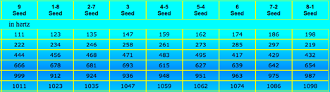 You will notice that the doubling pattern (vertical column) is used in the same way as I wrote regarding the patterns of the Sri Yantra (The Jericho Moment… http://gwhardin2.herokuapp.com/articles). But in this case there is a division of the doubling within each seed: (A) 1 … 2 … 4, and (B) 8 … 7… 5 (4 x2=8 … 8×2=16=1+6=7 … 7×2=14=1+4=5). So in the angelic Tonal Gateways, all the tones begin with these lower numbers (1, 2, 4). The reason for the division of the “doublings” is that the angels are connecting Heaven with Earth, with 1, 2, and 4 being the earthly tones. On the other side of the gateway, the angels sing the tones (what we call the “angelic choir”) that begin with 8, 7, and 5 as the energy bridge is connected between our worlds (6, 9 and 3 come from the Heart of Source, with the tones beginning with 3 also on the angelic side of the gateway). Both humans and angels must be present at the same time for this to work. It is a beautiful experience.