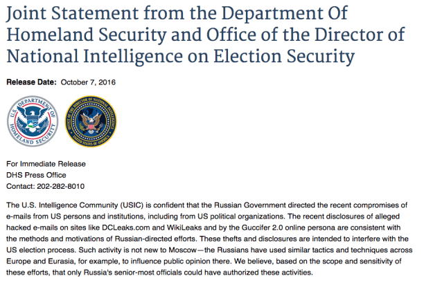 Within 24 hours of Newsweek’s Eichenwald sending out his emails and Tweets claiming, but not providing, his “Russianproof”, this report notes, the Obama regimes Department of Homeland Security (DHS), on 7 October, issued a document titled Joint Statement from the Department Of Homeland Security and Office of the Director of National Intelligence on Election Security that, in part, stated: “Some states have also recently seen scanning and probing of their election-related systems, which in most cases originated from servers operated by a Russian company. However, we are not now in a position to attribute this activity to the Russian Government.”