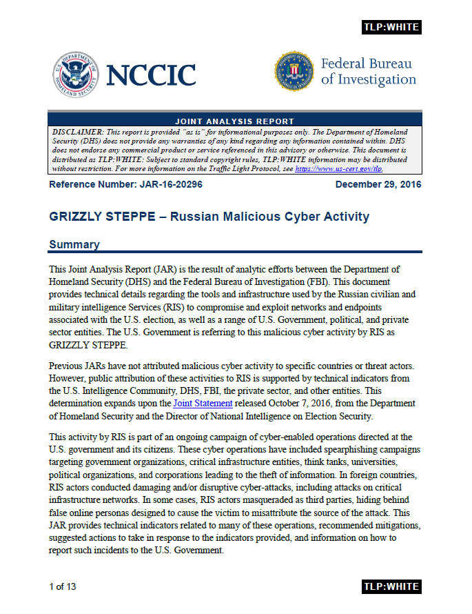 And from that time to now, this report continues, the Obama regime, Hillary Clinton and the US mainstream propaganda media have continued to maintain one of the greatest, and most shamefully dishonest, political charades ever witnessed in American history—first begun by anonymous CIA leaks to the Washington Post alleging Russian hacking of Podesta’s emails, and culminating in the DHS, again, issuing a report, on 29 December, titled GRIZZLY STEPPE – Russian Malicious Cyber Activity, that says in its opening Disclaimer: “The Department of Homeland Security (DHS) does not provide any warranties of any kind regarding any information contained within.”