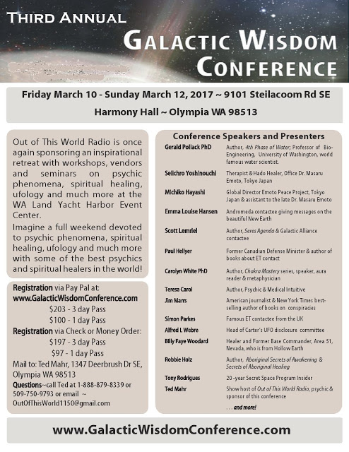 Out of this World Radio (www.outofthisworld1150.com) is sponsoring a fantastic spiritual healing and UFO/ET event, with workshops and vendors on psychic phenomena, UFOs and ETs, and much more in Olympia, Washington March 10, 11, and 12, 2017! See: www.galacticwisdomconference.com