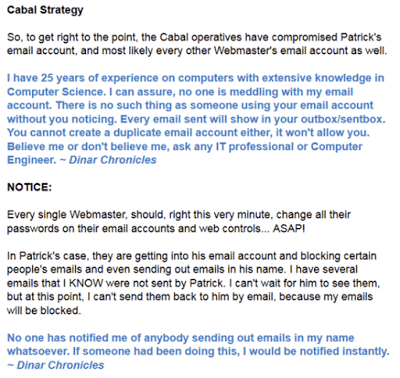 I have 15 years of experience on computers with extensive knowledge in Computer Science. I can assure, no one is meddling with my email account. There is no such thing as someone using your email account without you noticing. Every email sent will show in your outbox/sentbox. You cannot create a duplicate email account either, it won’t allow you. Believe me or don’t believe me, ask any IT professional or Computer Engineer. ~ Dinar Chronicles