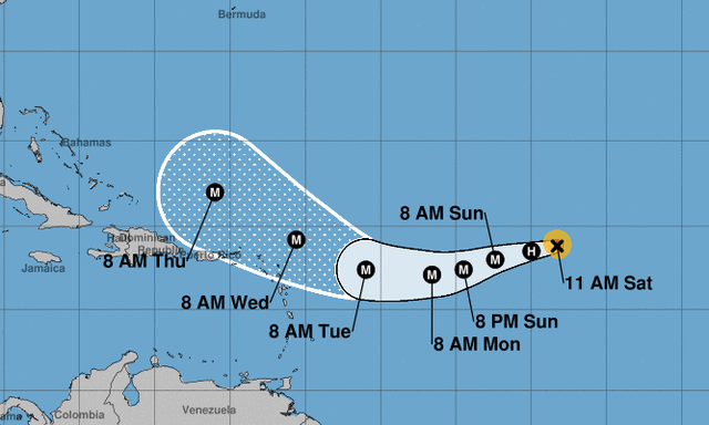 The storm is now located about 1,220 miles east of the Leeward Islands in the Caribbean and moving west at 15 mph. It is expected to slow down and move toward the west-southwest over the next several days, the NHC said.