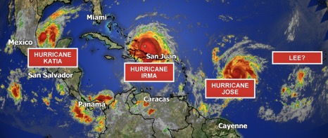 Just look at the even spacing knowing that a fourth hurricane, Harvey, made landfall in Houston two weekends earlier and dumped 52 inches of water.