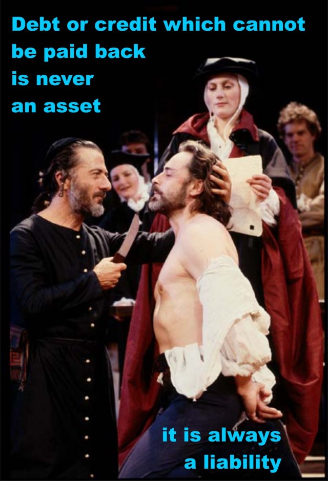 Fabricated or parasitic so-called “wealth” destroys value by diluting the value of real productive wealth. Debt or credit which cannot be paid back is never an asset; it is always a liability. That some people in the market can be fooled into buying such liabilities and thus generate sale profits and transaction fees is risible.