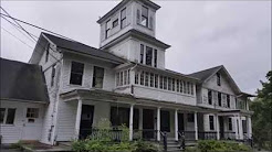 Beautiful flight over New England village of Victorian brick buildings. The scene is Medfield State Hospital, an abandoned mental