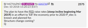 ‘The plan to have the FED raise rates [steep incline beginning March 2019] in an effort to ‘kill’ the economy prior to 2020 P_election is known and planned for. Structure change coming?’ Q