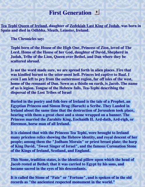 Tea Tephi, Queen of Ireland, and descendant of the Kings of Judah – Sun Tzu (Jeff Dougherty) Lineage to King David, the Shepard, whom slung the stone at Goliath