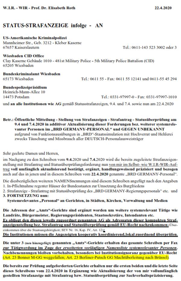 Subject: Public communication – filing of criminal charges – criminal complaint – verification of company status on 9.4 and 7.4.2020 by updating these requirements in addition to other system-relevant requirements From persons in ‘BRD GERMANY-PERSONAL’ and AGAINST UNKNOWN as a result of functional exercises in ‘BRD’ state high treason simulation and receiving stolen goods with a view to deception and misuse of all DEUTSCH identity card holders