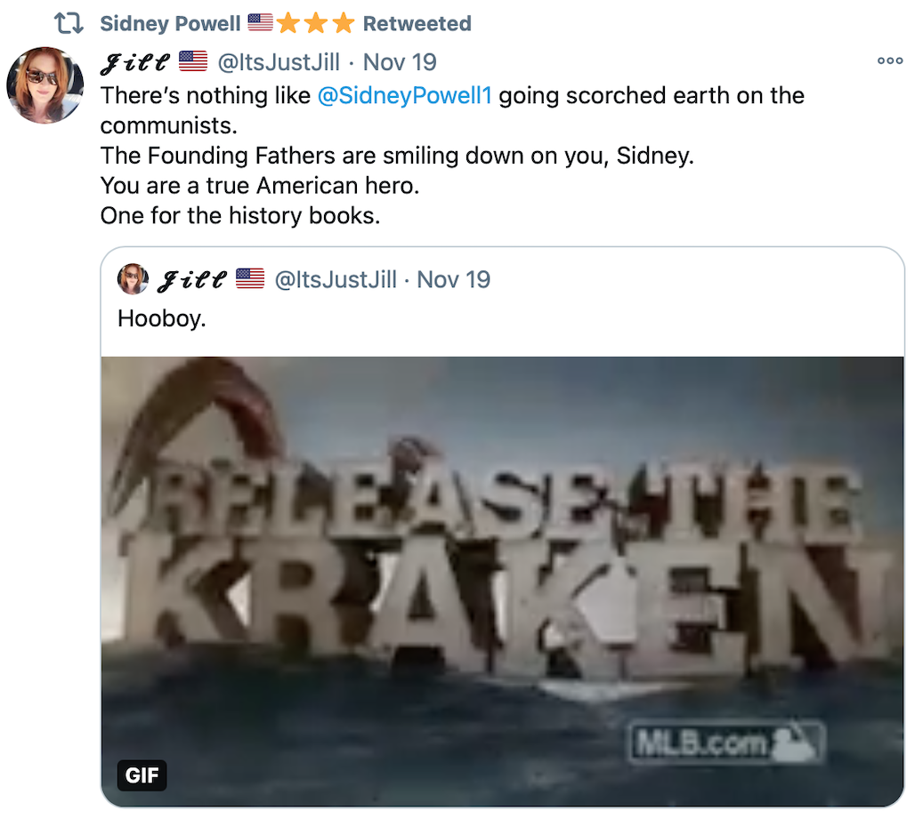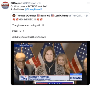 I joined Twitter the other day (what got into me I do not know) but I Tweeted a reply on Sidney Powell’s Twitter page and got re-Tweeted… I think. Anyway. Still learning.