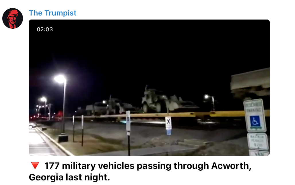 Telegram has been posting a number of videos from all over the country of MASSIVE Military arriving in different states across the country. HUGE numbers of Troops and Armaments. It’s astounding.