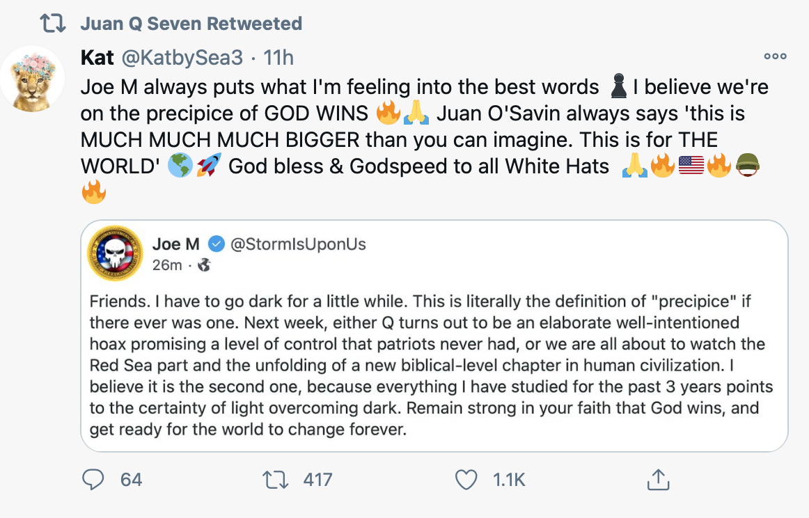 I maintain that the “real” Juan O’Savin sneaks on Twitter sometimes. I can’t prove it. I just feel it. The different Juan O’Savins have VERY different personalities. But there is one that feels very 107 to me and I’ve had that confirmed in subtle ways for months. That’s all I’ll say about that.