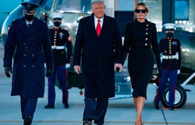 Photo of POTUS and FLOTUS leaving White House 1-20-21 He is wearing a dark navy suit, black coat, white shirt and red tie (!!!) JC Kay’s remote view was recorded BEFORE this event.