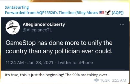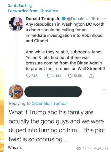 Is this the Rallying of Main Street America without party lines? What happens when an investigation on Robinhood and Citadel occur and it reveals Janet Yellen has been paid by Citadel for “speaking fees”. Wouldn’t this be worse than a conflict of interest? She is now the Treasury Secretary (via the faux administration) and Peter Strzok’s wife is the head of the SEC. How can any of this corruption ever get a fair investigation?