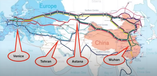 2:23:30 Charlie Freak: What you’re looking at is the old Silk Road that went from Europe across Asia all the way to the East China Sea… and now the New Silk Road… Wuhan… to Astana/sa/tan… to Tehran… to Venice… In the exact center between Venice and Wuhan, so Astana/sat/an was carefully chosen…
