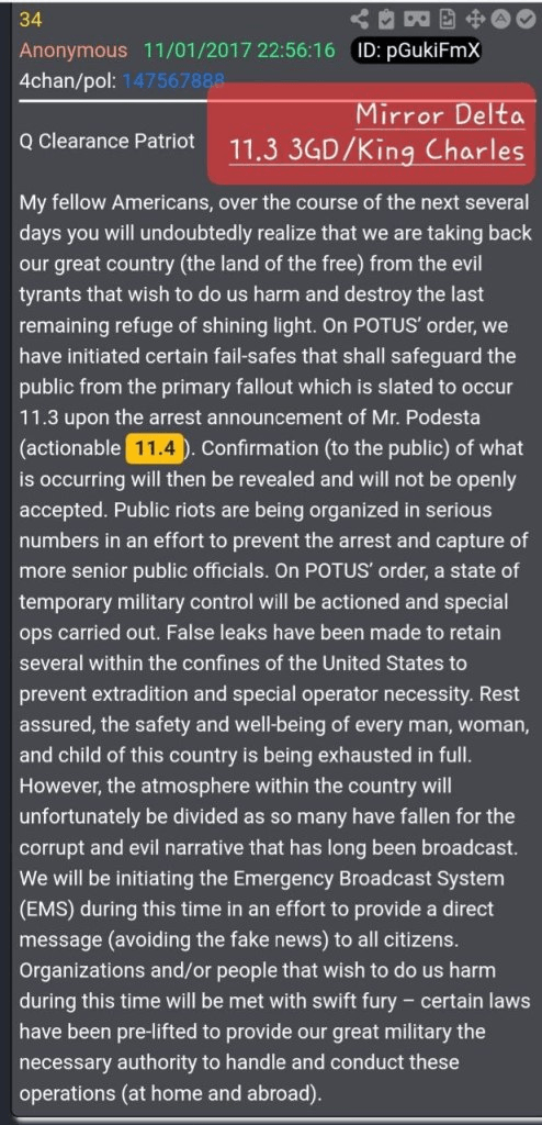 (Posted @ 4chan 11/1/2017) Special Public Announcement From ‘The Q Team’ About EBS & SHTF on 11/3/2022 (Meme)