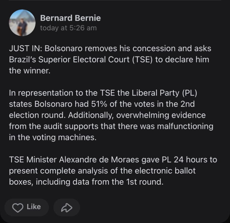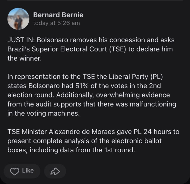 In Brazil President Jair Bolsonaro has provided the courts with evidence of election fraud going back over a decade (In the US it goes back two decades). Bolsonaro sent the following message to his people on social media: