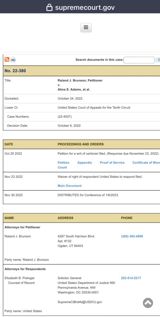 2. On each piece of paper write attention to the “9 Supreme Court Justices”. Express support of Brunson vs Alma S Adams et al, No.: 22-380. Sign your name and date it. You can write more. It’s that simple.