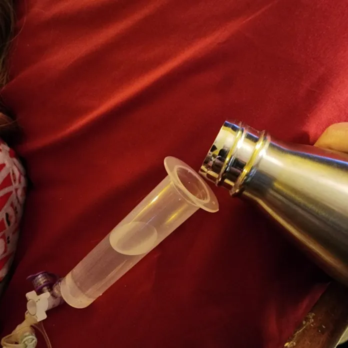 You can put any kind of water into the G-Tube that you would normally drink. Just make sure it’s close to room temperature. I poured it in fairly slowly, trying to mimic the rate that one might drink the water naturally. What I used is: plain filtered water, hydrogen-water, and ionized water. You can read more about the benefits of ionized water and hydrogen water in the “Further Reading” section, below.