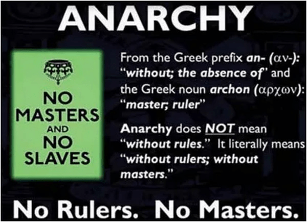 “The weaponized media propaganda system would have you believe that Anarchy is something to be feared because without ‘Gubernare Mente’/ Government, there would be Mad Max chaos and murder in the streets. The reality is that Anarchy is a philosophy of peace where most anarchists believe in the NonAggression Principal, where initiating violence is illegitimate except in self-defense or protection of property.”