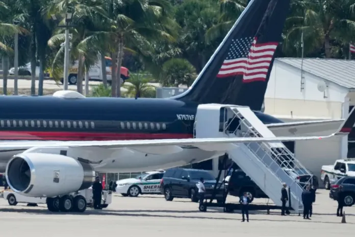 Former president Donald Trump waves at the top of the stairs as he boards his plane at Palm Beach International Airport, Monday, April 3, 2023, in West Palm Beach, Fla. (AP Photo/Rebecca Blackwell)