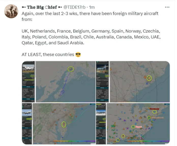 Over the last 2-3 weeks, there have been foreign military aircraft from: UK, Netherlands, France, Belgium, Germany, Spain, Norway, Czechia, Italy, Poland, Colombia, Brazil, Chile, Australia, Canada, Mexico, UAE, Qatar, Egypt, and Saudi Arabia. AT LEAST, these countries
