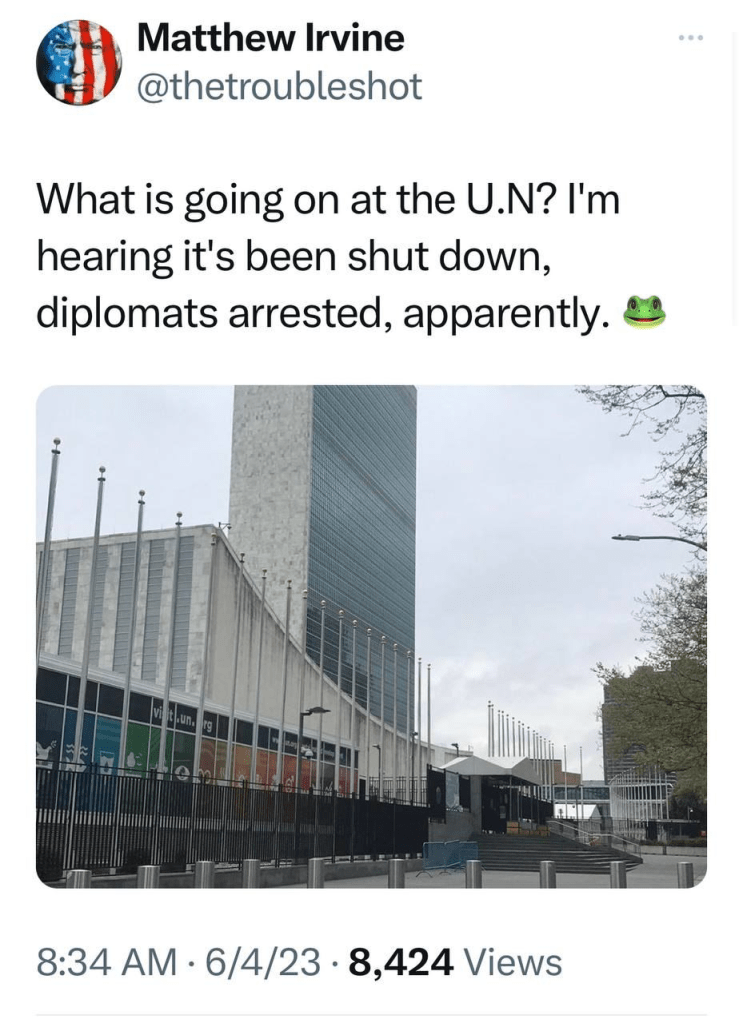 | The images are thumbnails. If you click on an image, it will expand in a new tab.Source: https://benjaminfulford.net/2023/06/12/the-us-corporation-did-go-bankrupt-what-we-are-watching-now-is-corporate-bs/~~~~~~~~~~~~~~~~~~~~~~~~~~~The US Corporation did go bankrupt, what we are watching now is corporate BSBy Benjamin Fulford June 12, 202314 CommentsThe US Corporation really did go bankrupt earlier this month and what we have been watching on our so-called news is corporate theatrical performances. The evidence for this is clear.The first thing to notice is that Washington DC remains a ghost town. As this news item confirms, US Government workers “are choosing to stay home, perhaps for good, leaving vast federal offices empty and the city struggling.”https://news.yahoo.com/us-capital-sputters-federal-workers-014754534.htmlThe corporate excuse is that they are “teleworking.”The next bit of evidence is a photograph sent to us by P3 Freemasons showing the Rockefeller-owned UN Headquarters building in New York apparently shuttered. We are asking readers in New York to personally confirm if this is true.Yet another proof is that US ports have shut down and trade is collapsing. The shutdown of ports like Seattle is being blamed on “labor disputes,” but that does not explain the collapse in demand for cardboard boxes, a mainstay of trade. |