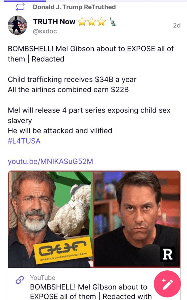Now Trump retruthed this post today stating that Mel Gibson is about to expose all of them in a four-part series exposing child slavery.