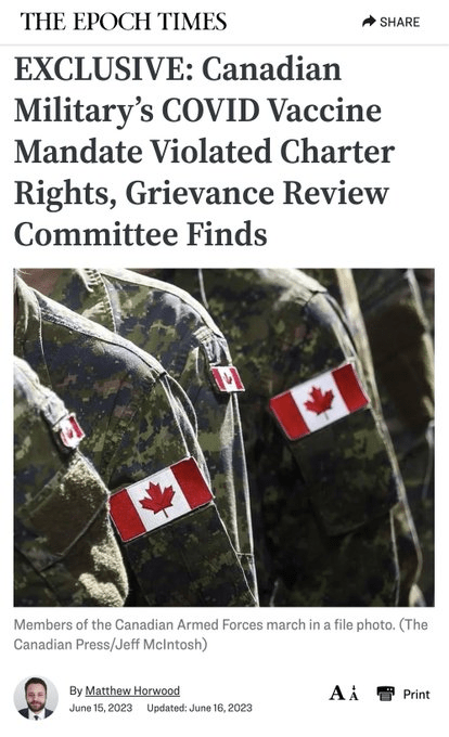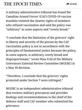 EXCLUSIVE: A military administrative tribunal has found the Canadian Armed Forces’ (CAF) #COVID vaccine mandate violated the charter rights of members who refused vaccination and said the policy was “arbitrary” in some aspects and “overly broad.”