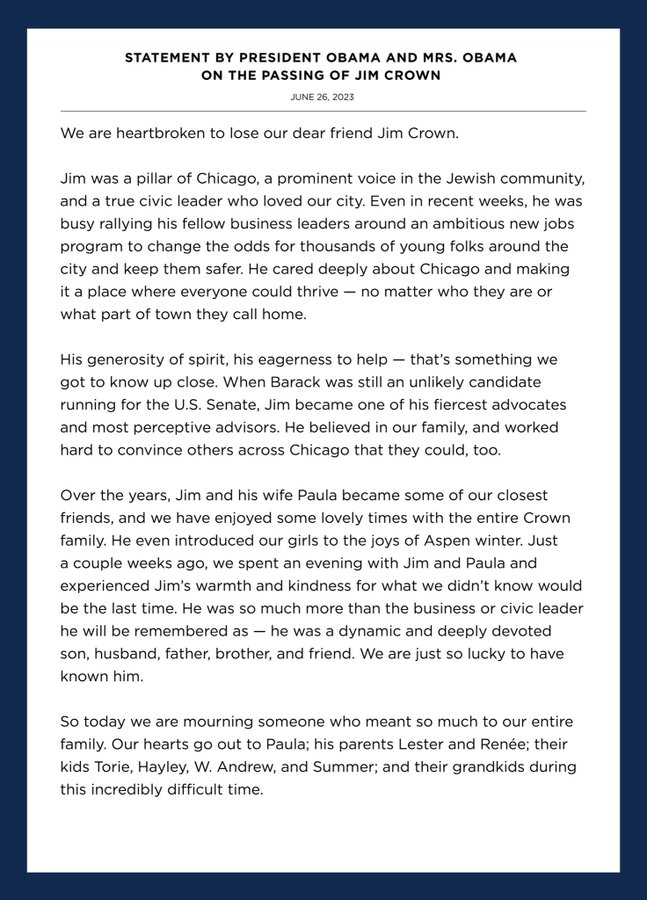 Jim Crown was a pillar of Chicago who cared deeply about making our city a place where everybody can thrive. Michelle and I were also very lucky to call him a dear friend. We’re heartbroken today, and we send our love to Paula and their wonderful family in this difficult time.