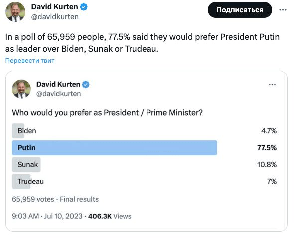 People in the West know this too. A Twitter poll of British politician David Courten showed 77.5% of voters would prefer to be led by Putin. Note that “Biden” can’t get even 5%, but somehow got 80 million votes in 2020?