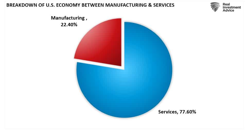 This next chart shows that only 22% of US economic activity is based on physical reality. The rest are YouTubers, “financial advisers,” lawyers, etc.