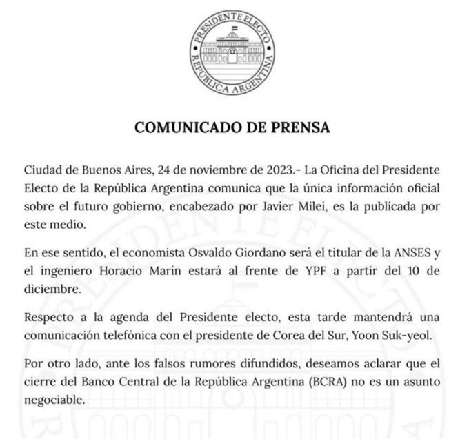 🚨 BREAKING: Argentina’s President-elect Javier Milei says he will close the country’s central bank “The closing of the Central Bank (BCRA) is non-negotiable.”