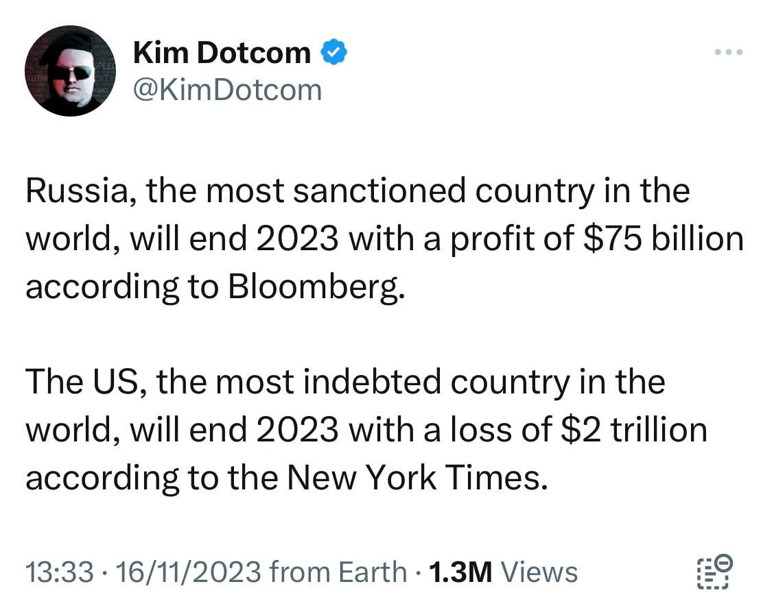 As Kim.com points out “Russia, the most sanctioned country in the world ends 2023 with a $75 billion profit…The US, the most indebted country in the world will end 2023 with a loss of $2 trillion.”